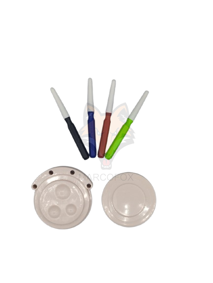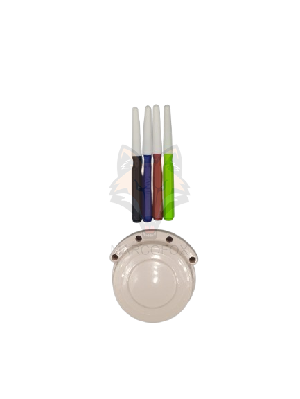 Kit porta óleo, contendo 4 canetas e um recipiente.