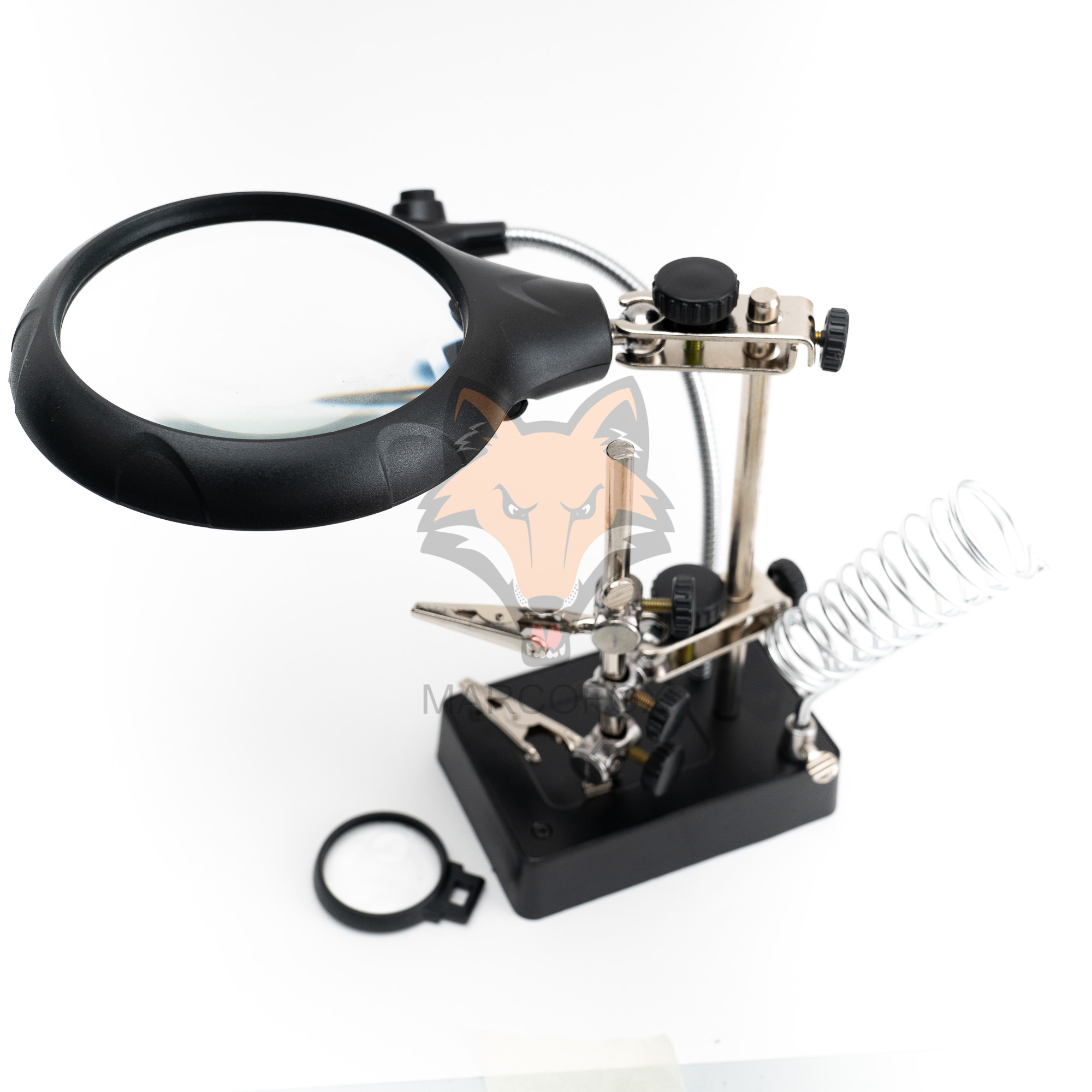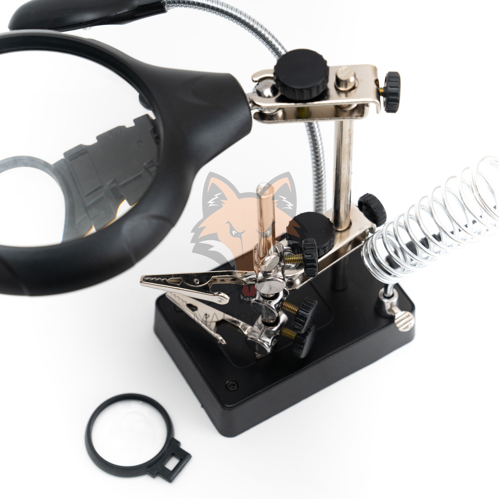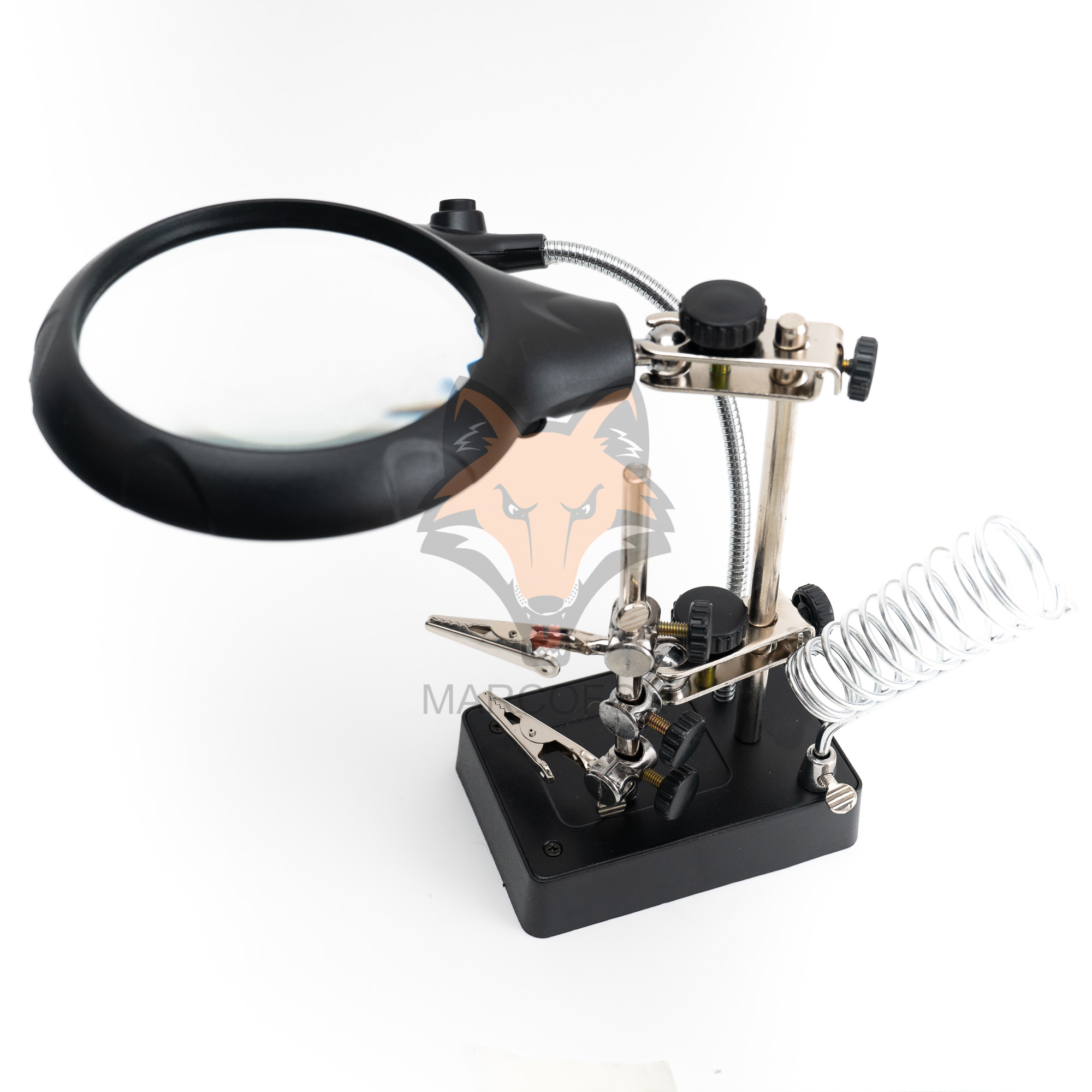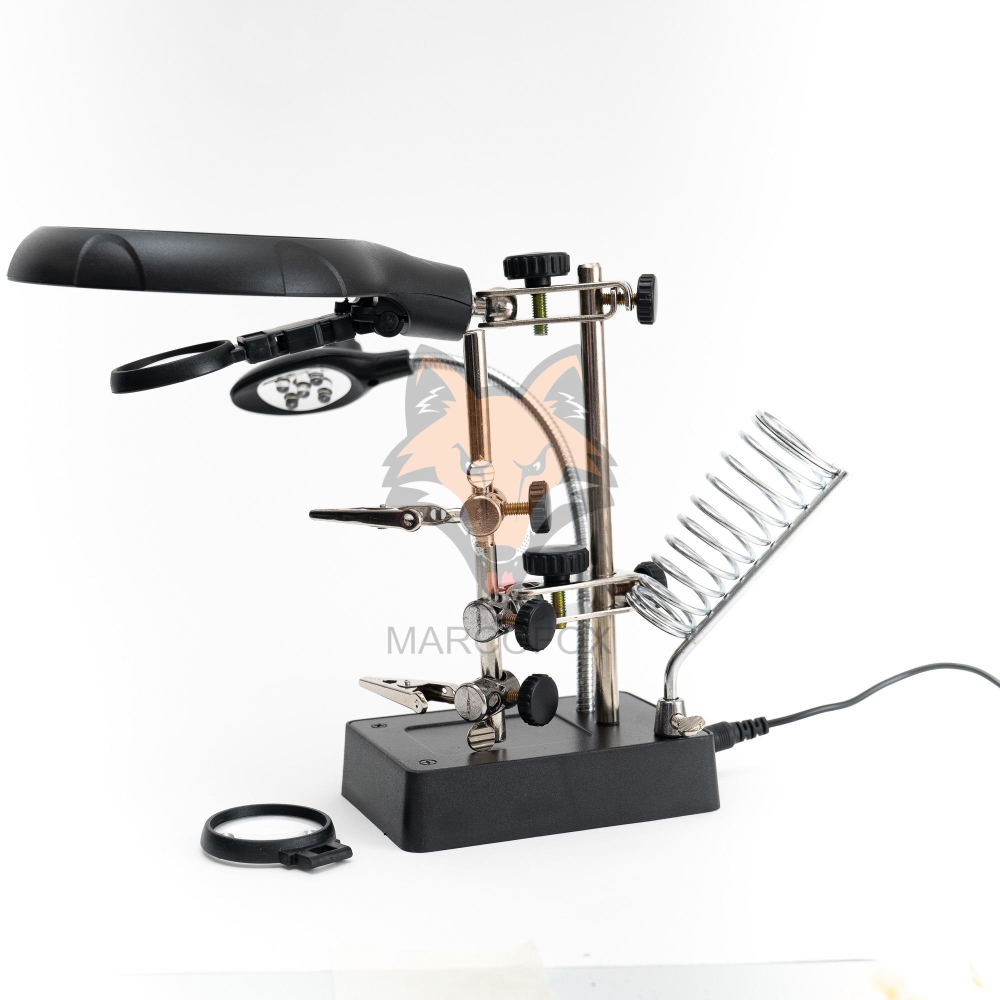 Suporte com iluminação de 5 LEDs e 2 lupas. Possui 2 clipes ajustáveis e um suporte de soldador. Funciona com bateiras AAA ou energia externa