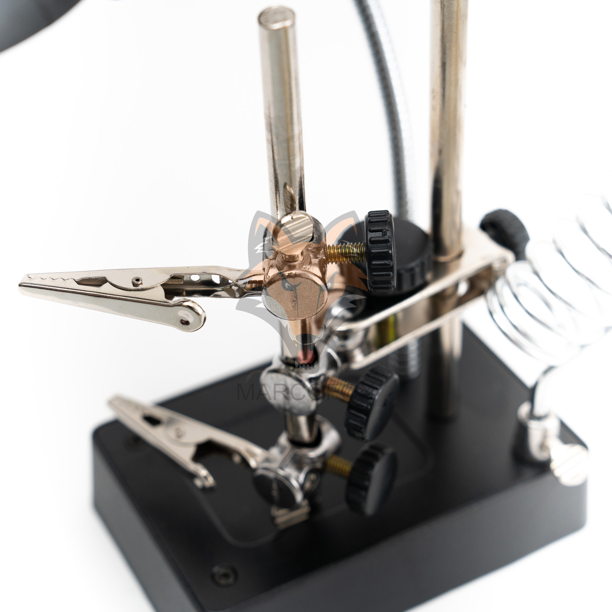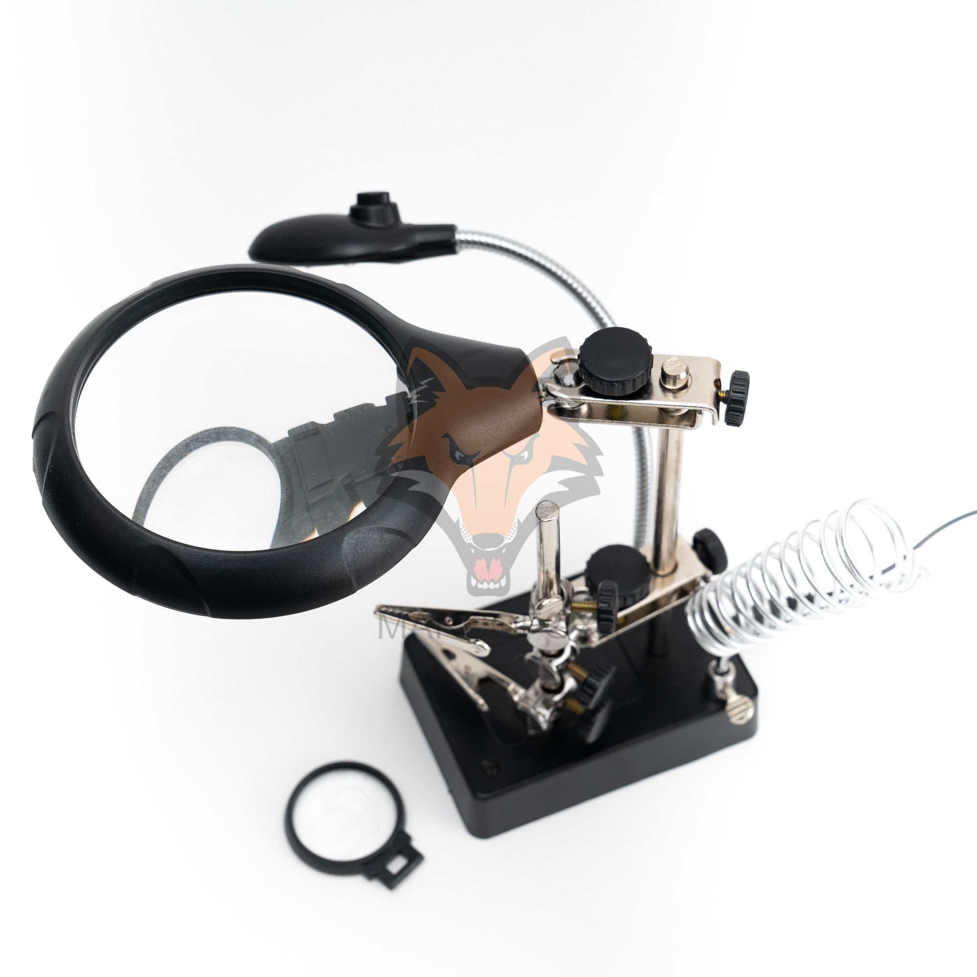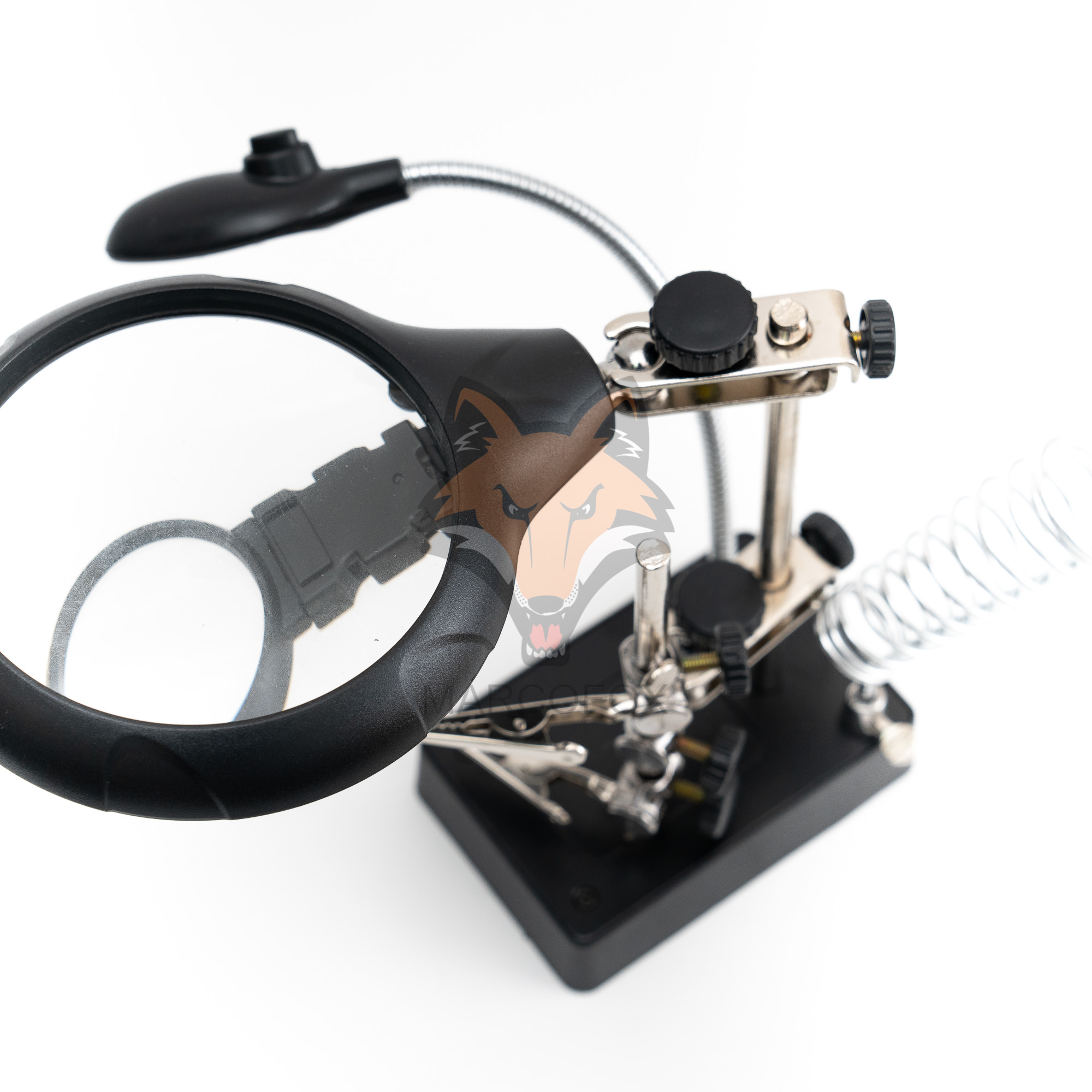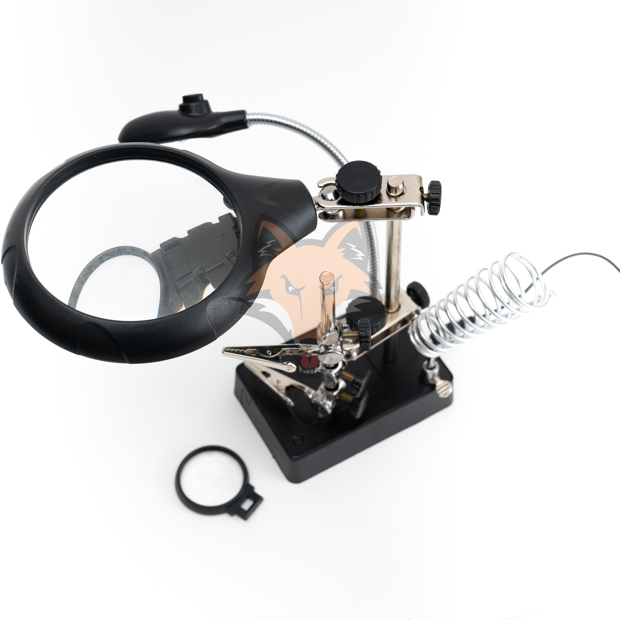 Suporte com iluminação de 5 LEDs e 2 lupas. Possui 2 clipes ajustáveis e um suporte de soldador. Funciona com bateiras AAA ou energia externa