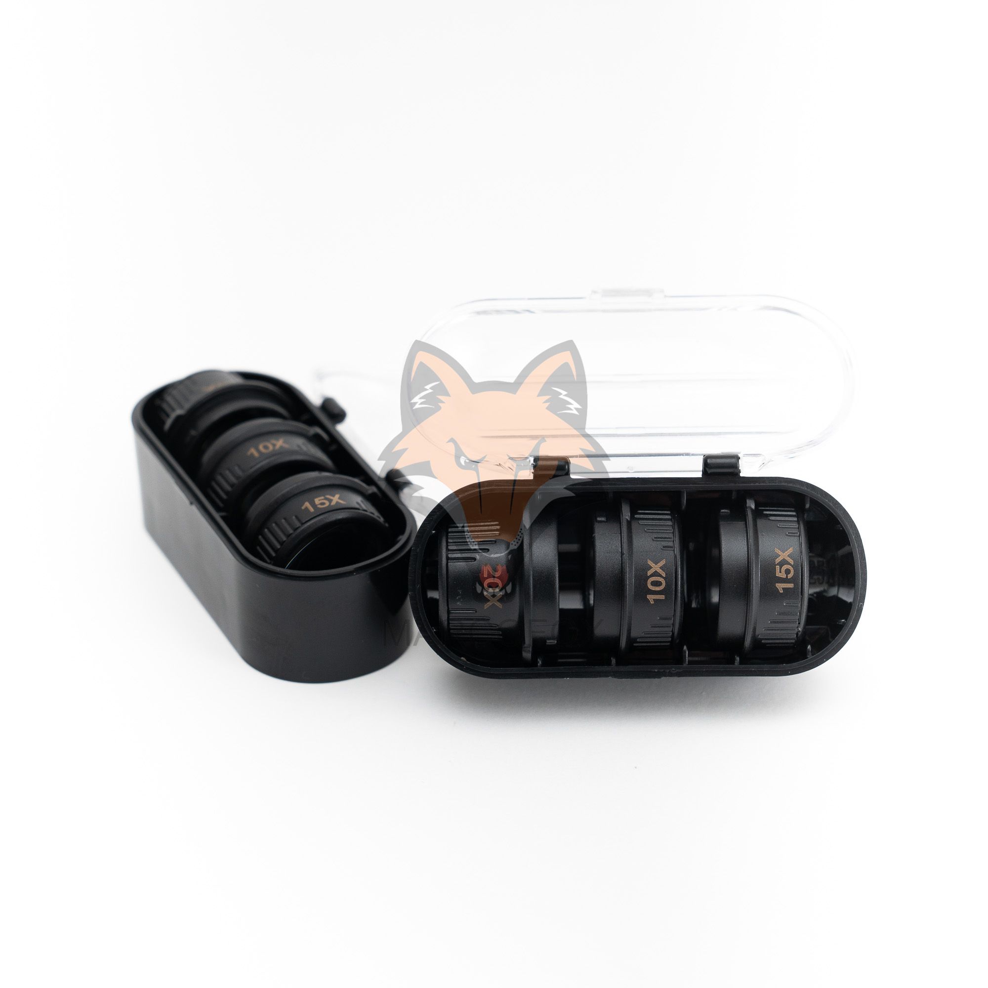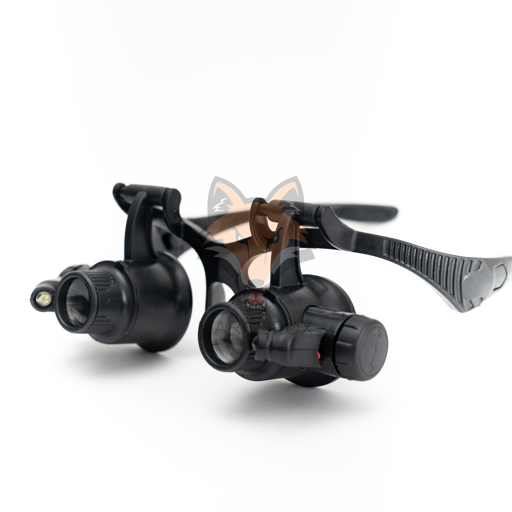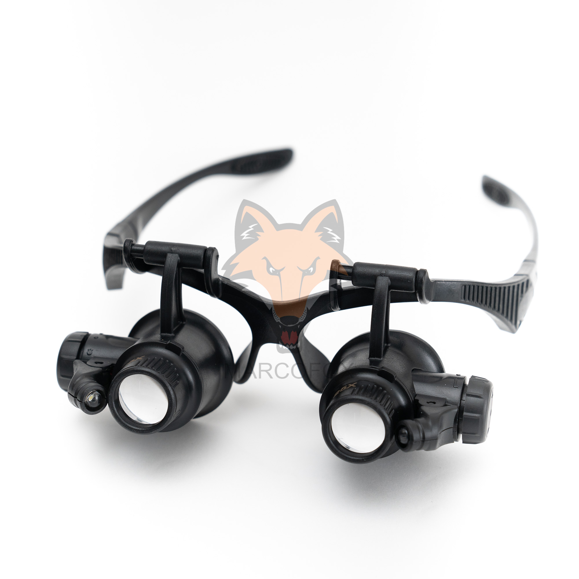 Óculos com lupas removíveis. Possui 2 LEDs, um em cada lado. Acompanha 4 lupas com ampliações. 10x, 15x, 20x e 25x