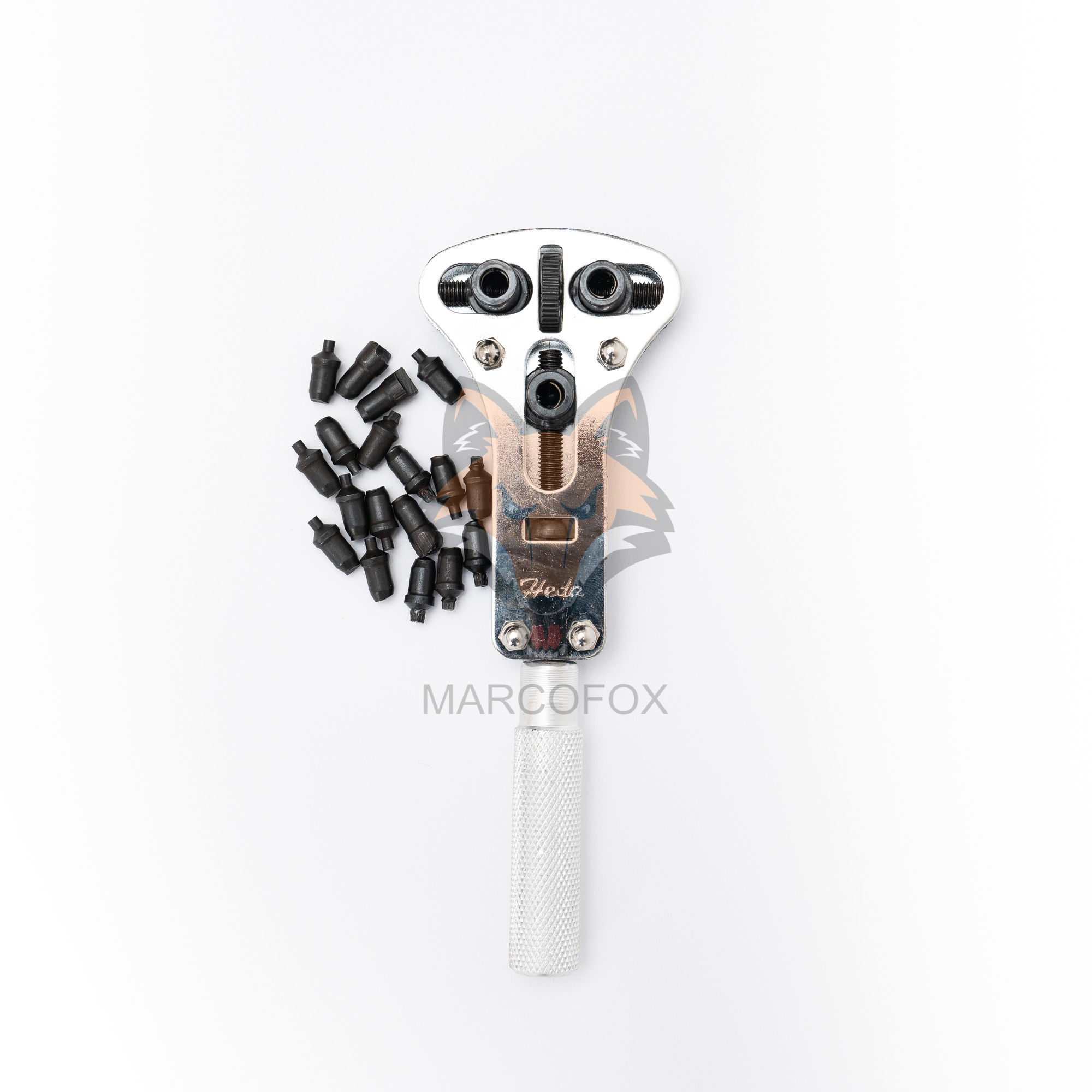 Chave de 3 pontas ajustável usada para abrir fundo de relógio. Possui 6 conjuntos de pontas diferentes que podem ser modificadas.Capaz de abrir relógios de ate 33mm