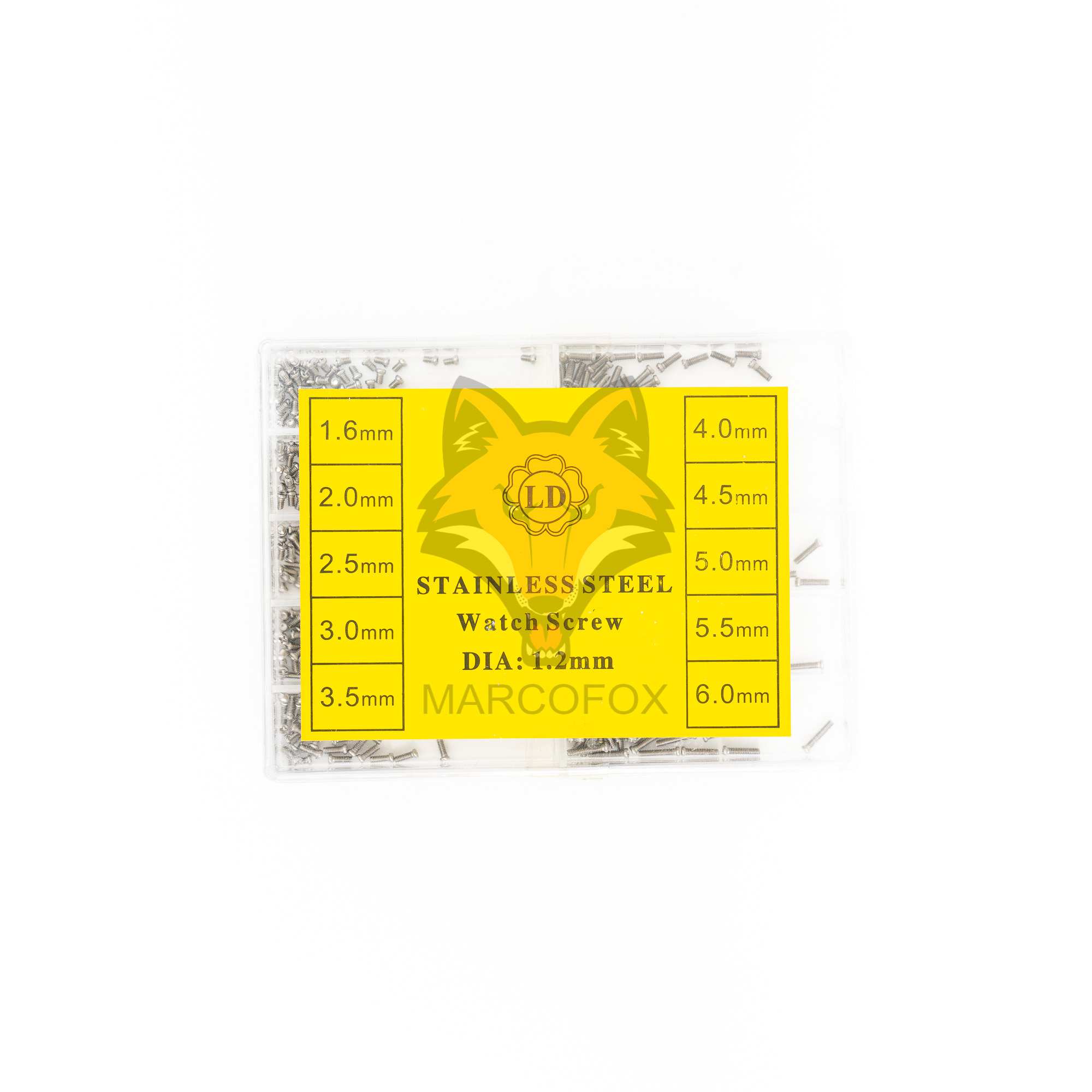 Box contendo parafusos para relógios/óculos com 10 tamanhos. 1.6mm, 2.0mm, 2.5mm, 3.0mm, 3.5mm, 4.0mm, 4.5mm, 5.0mm, 5.5mm e 6.0mm.