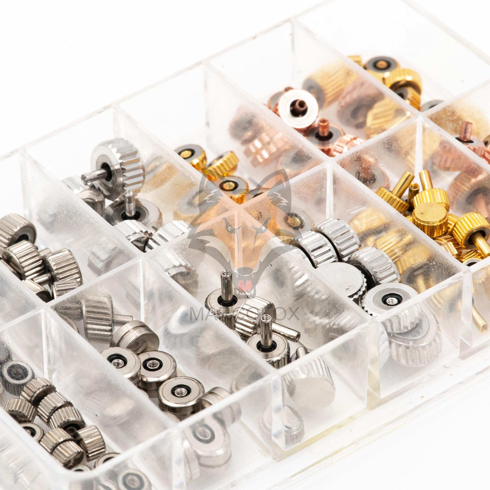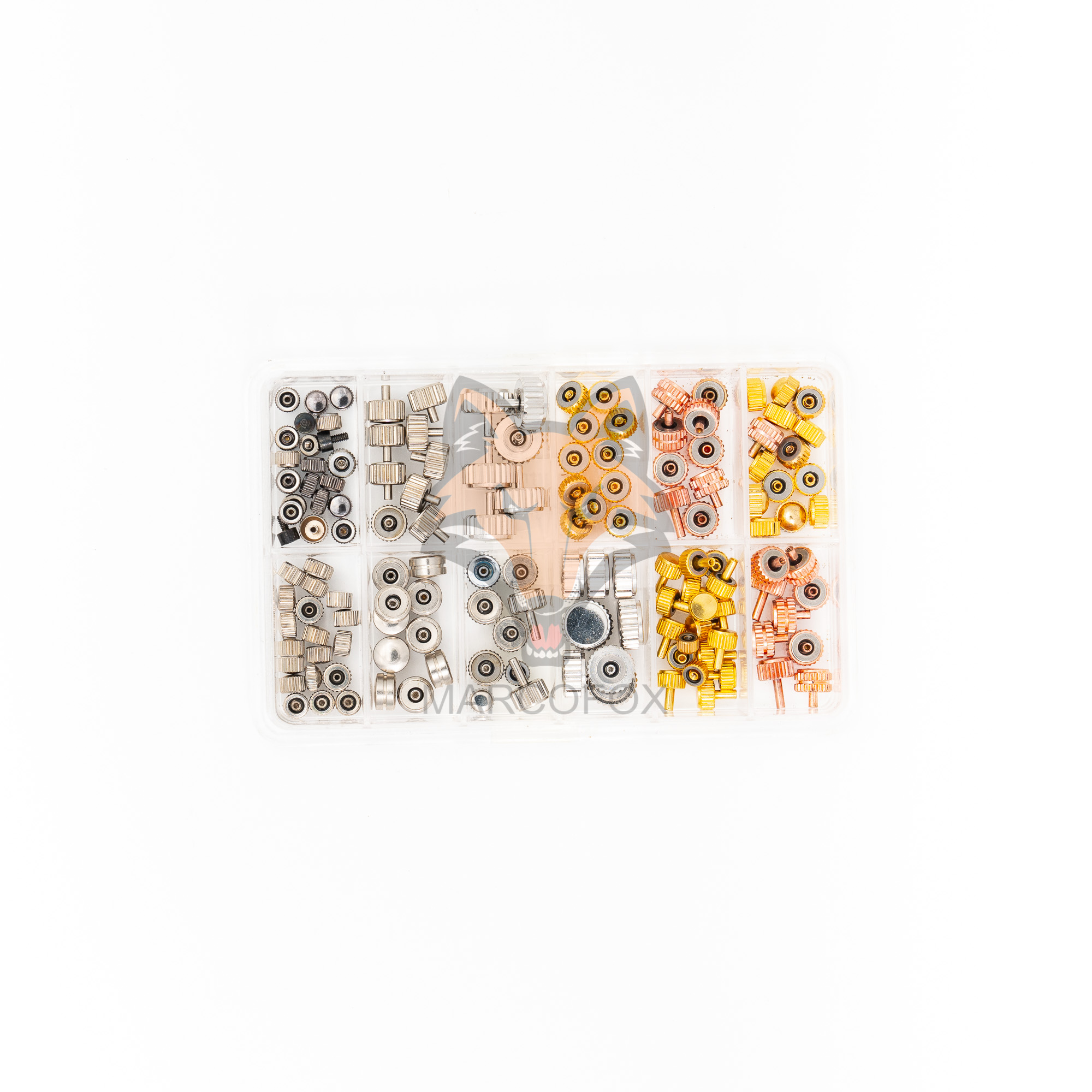 Box de coroas para relógios. Com cores e formas diferentes.